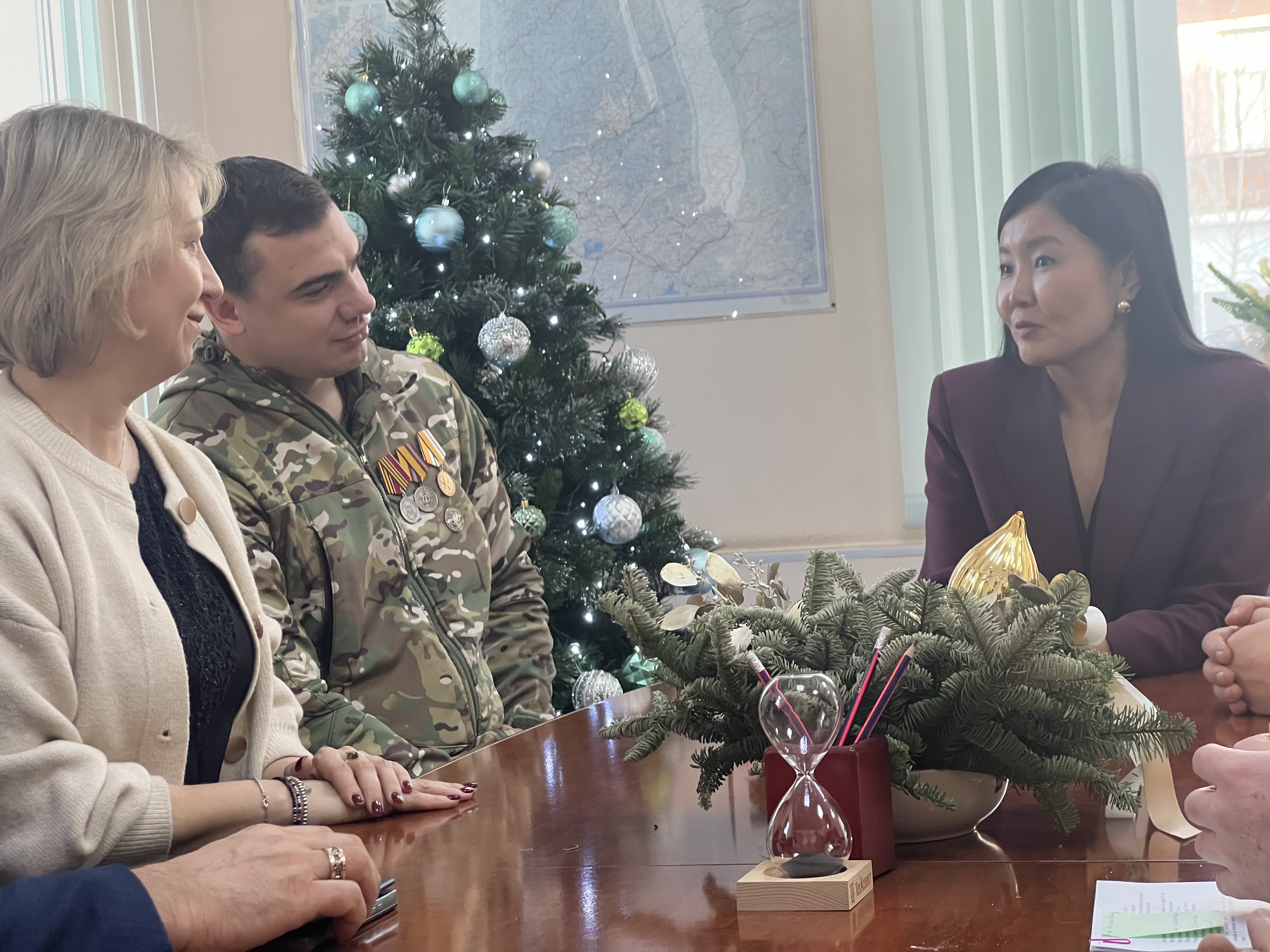 Участник спецоперации, забайкалец Никита Ивкин и руководители институтов поддержки бизнеса, а также министр экономического развития Забайкалья встретились для того, чтобы передать бойцам на передовую слова поддержки и подарки.